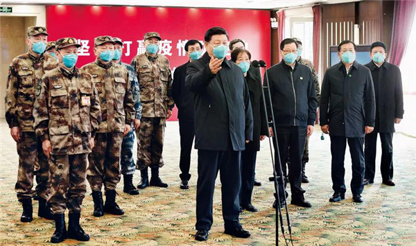 2020年3月10日,中共中央总书记、国家主席、中央军委主席习近平专门赴湖北省武汉市考察新冠肺炎疫情防控工作。这是习近平在火神山医院指挥中心视频连线感染科病房,与病房内患者和医务人员亲切交流。新华社记者 谢环驰/摄
