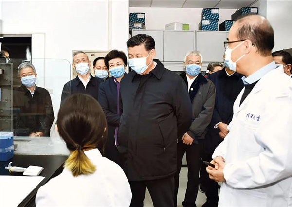 2020年3月2日,中共中央总书记、国家主席、中央军委主席习近平在北京考察新冠肺炎防控科研攻关工作。这是习近平在军事医学研究院重大疫情应急防控药物研究室了解疫苗和抗体研制情况。新华社记者 丁海涛/摄