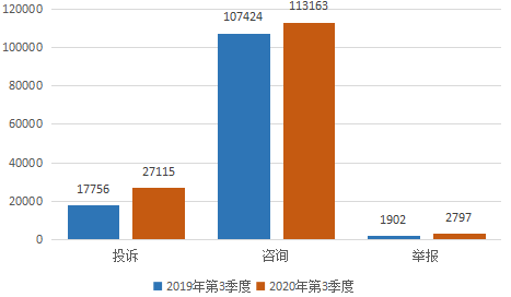 2020年三季度,12315投诉举报指挥中心受理全省消费者投诉27115件,业务咨询113163件,违法举报2797件,共计143075件(含省消协数据),与2019年同期相比上升了12.6%。已办复136900件,办复率95.7%,为消费者挽回经济损失1315.4万元。通过QQ、微信、微博发布消费提示、市场监管动态、新闻资讯160篇。