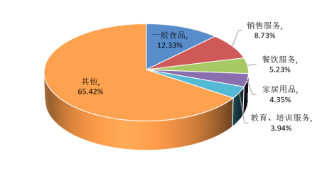 全省投诉量位列前五位的分别是:一般食品、销售服务、餐饮服务、家居用品、教育培训服务,合计占比34.58%。