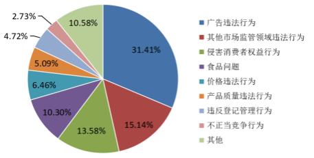 举报问题主要集中在:广告违法行为、其他市场监管领域违法行为、侵害消费者权益行为以及食品相关问题。其中有关广告违法行为方面举报仍居首位,占举报量的31.41%。