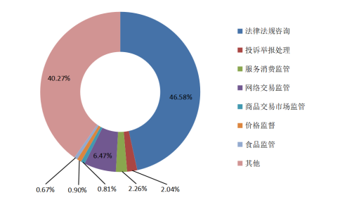 三季度,全省共受理咨询127021件。排名前五位的分别是法律法规咨询、投诉举报处理、服务消费监管、网络交易监管、商品交易市场监管。其中有关法律法规方面咨询居首位,占咨询总量的46.58%。